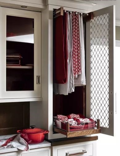 If you would you use table linens more if they were neatly pressed and easily accessible, there may be a creative storage solution making these items more accessible and efficient. There are two places for keeping table linens at the ready. Use a pull-out rack (originally intended for pant storage in closets) that can double as your linens’ depository, and place them either in the pantry or kitchen.