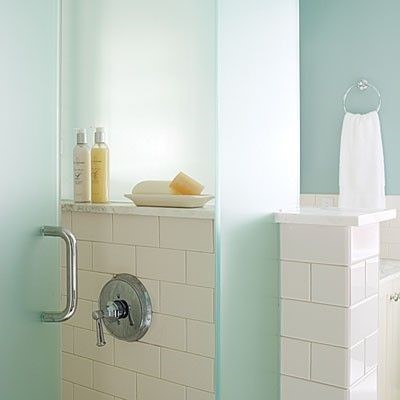 Showers can be placed in corners of larger baths, we have designed bathrooms with showers in a separate room, and there are ways to make an obstructed view and still have a clear opening. Because we meet with clients for whom privacy is a concern, we thought we would share the simplest solution; obscure glass. This is also a good solution for people who are unhappy with seeing water spots or who want to squeegee less.