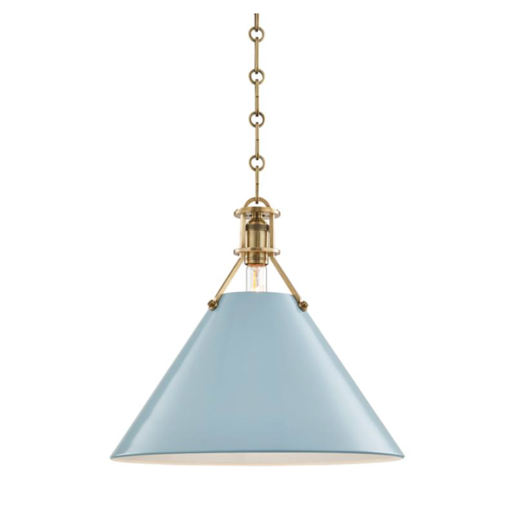 Speaking to Benjamin Moore’s color pick for the year, the painted pendant below By Hudson Valley Lighting, in Blue Bird, is right on trend and still feels timeless with brass accents. It comes in a host of colors and sizes including sconces, but this one is kitchen-ready!