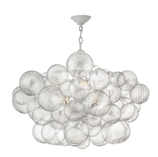 We love Visual Comfort as a lighting source. They have been around long enough to know what works- their assortment is considerable, but refined enough that you can’t go wrong with their offering. The first clear glass chandelier below with its gathered glass globes feels like a cloud floating by; and what a treat it would be to see it lit. It comes in one size only- Large!- it is a statement piece and is available in three finishes.