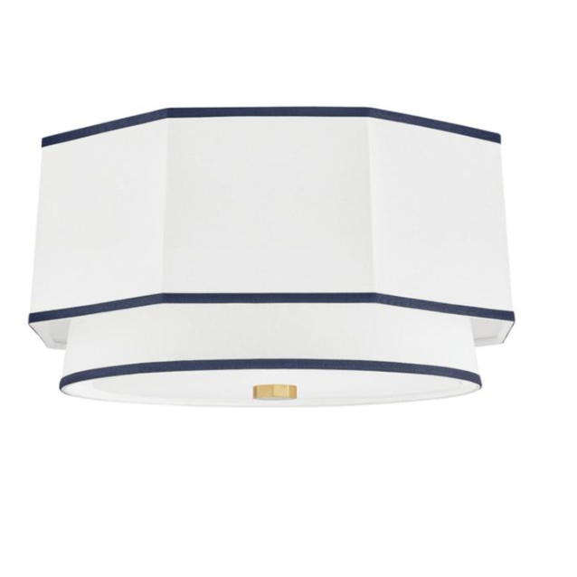 Flush Mounts are practical when you want overhead lighting that won’t impede on headroom. The white wrapped flush mount from Hudson Valley Lighting hits all the right notes in crisp white with navy and brass accents. Classic style awaits.