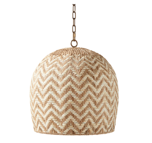 Serena and Lily with its laidback California and coastal vibe is a great place to find a lot of natural woven lighting. Here is a chevron patterned pendant made from bleached and natural rattan that can be used over a dining table in the large size and over a kitchen island using two smaller sizes. And since we were shopping around, we found this minimalistic concrete and wood combo pendant that may not be for every situation because of its opacity, but would be effective over an island.