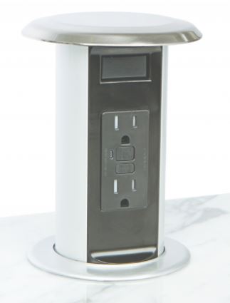 As our last takeaway from the Kitchen & Bath Design Show last month we offer one more item to consider- the Pop-Up Kitchen Power Grommet from Doug Mockett & Co. Not a new concept, but sleek and well-designed. The grommet is water tight, GFCI protected and tamper resistant, and it features circuit breaker protection for in use power safety. A press of the finger pops it up when needed and down to disappear into a nearly flush surface. This small addition to the kitchen counter allows easy access to plug-in and recharge.