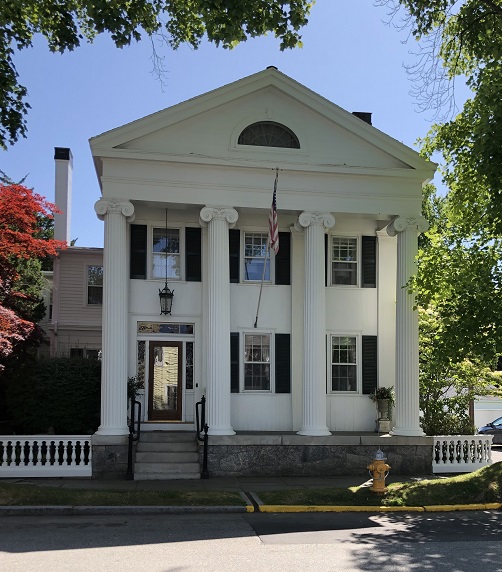 The Capt. Nathaniel B. Palmer House ia a transitional style between Greek Revival and Victorian Italianate (pictures courtesy of the Town of Stonington). The detail at the entry is unquestionably a blend Corintian meets fussy corbels. The image belows show a coupla which all estate houses in the area had in the day. Funfact: These couplas would be lit at dusk to alert nearby family who would be hosting cocktail hour.
