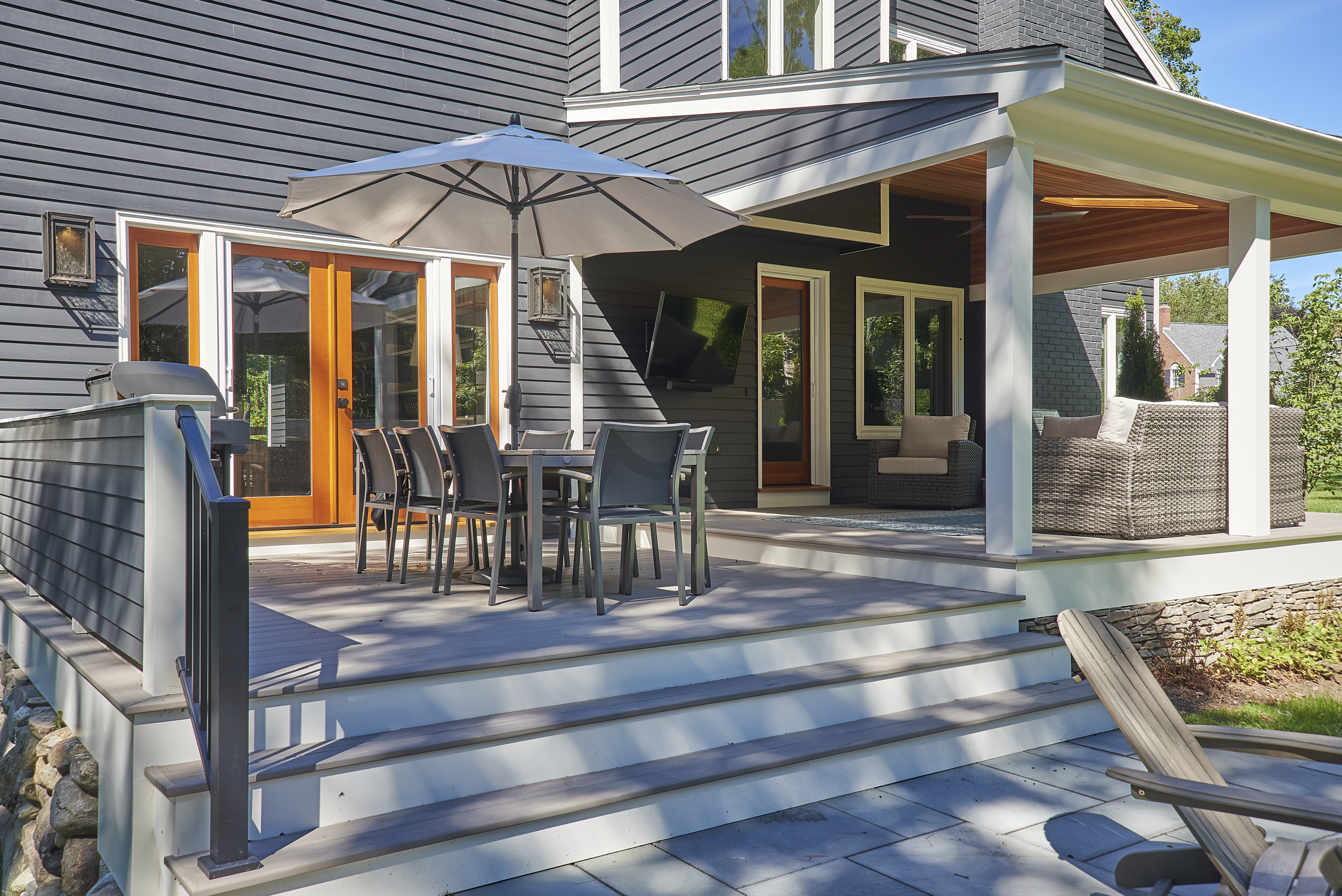 The Challenges & Approach: While the designers looked at possibilities for building distinct areas for multiple uses, they wanted to tie the main area in with the rest of the home’s exterior. Balance of the roof weight and the open deck on the home was needed to create asymmetry consistent with the existing style. Initial concepts revealed that the door used most often and closest to the kitchen should be the covered side. With two levels, the end result should be an effortless transition on the gently sloped lot that would work well with the overall landscape plan.