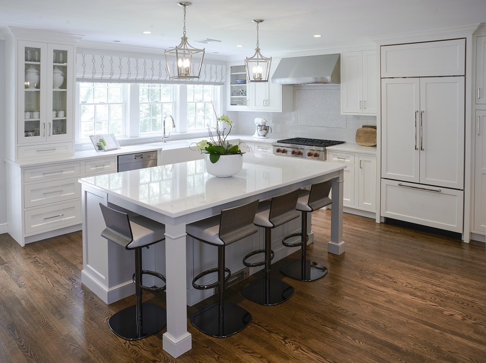Below, the island is constructed with strong square legs that are clean except for the molding with a backdrop of panels that finish off the rear of the island cabinetry. The pair of French-inspired lanterns warms the look and adds a touch of traditional, and the Owner selected a modern stool that mixes furniture art with interior architecture.