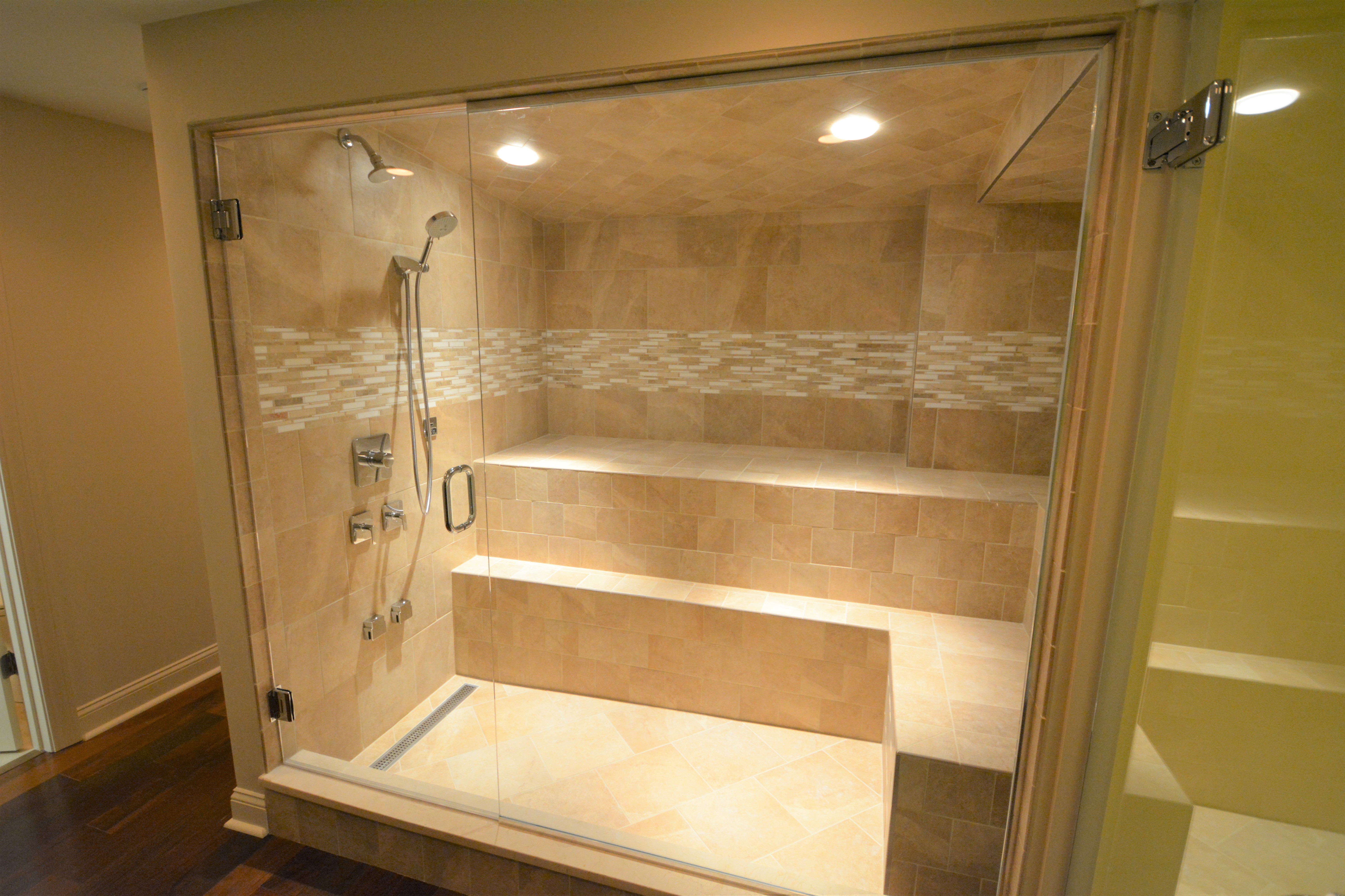 · Behind all that beautiful tile is the first important part, the substrate. Without a vapor proof under garment, steam showers and the attractive tile could prematurely fail. We love using the Schluter system because it creates a waterproof barrier and insulation. The ceiling in a steam shower needs to be pitched ever so slightly to allow most of the steam droplets to move away from the user. If this is a dedicated steam room, you will still benefit from adding a shower to assist in cleaning up, and it is also nice to add a bit of cool water for extended stays or to rinse before exiting. There will be a full glass enclosure and if height allows, a transom top is added to allow for air flow post steam. If this is going in a basement with lower ceilings, additional ventilation and leaving the door ajar is suitable.