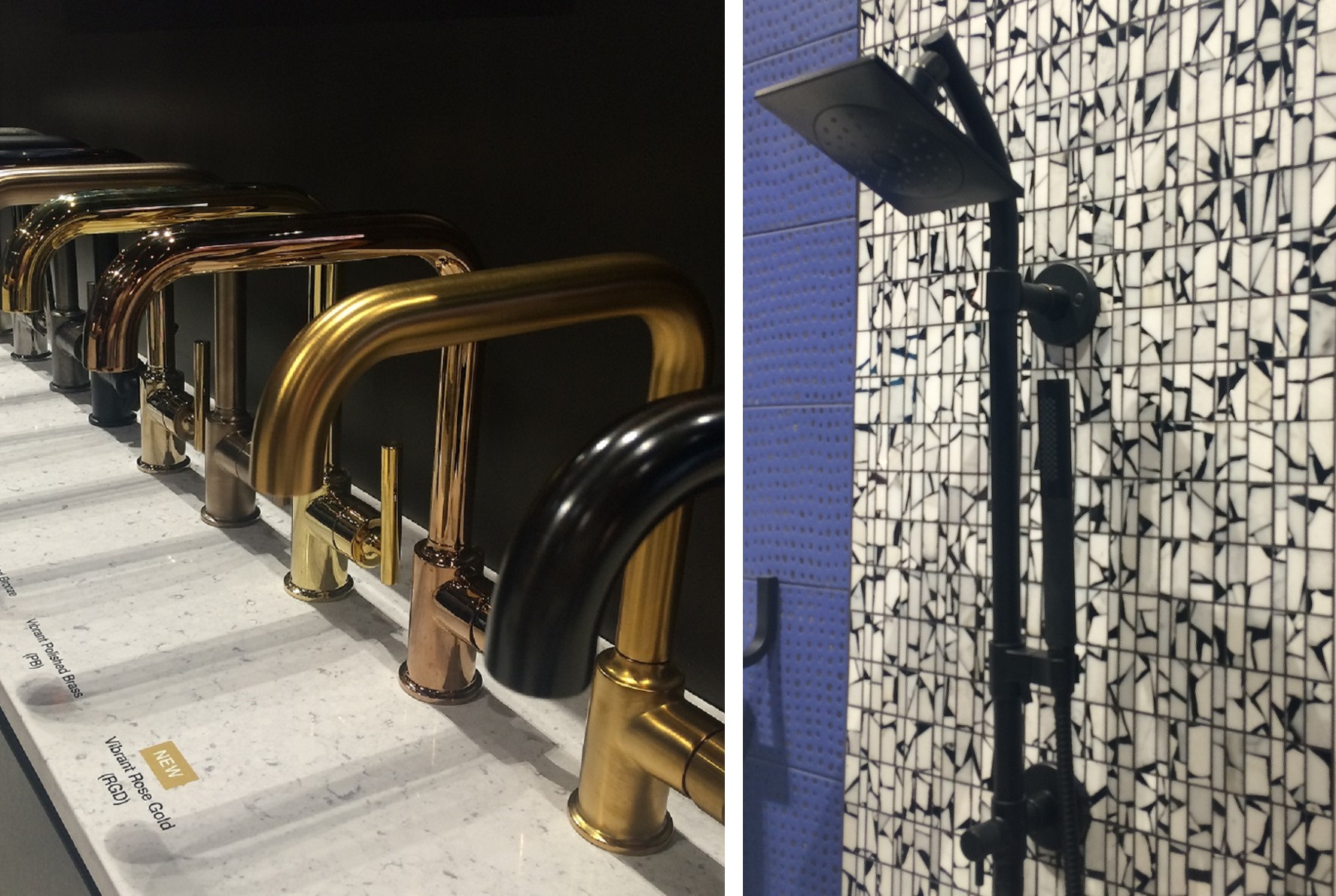 First of note, we saw the growing choices in hardware finishes. Holy Cow, Rose gold plumbing fixtures? I personally wouldn’t buy that on an iPhone so I probably won’t be recommending it. And before you decide that black plumbing fixtures, think about how much soap spots will bother you in between cleaning.