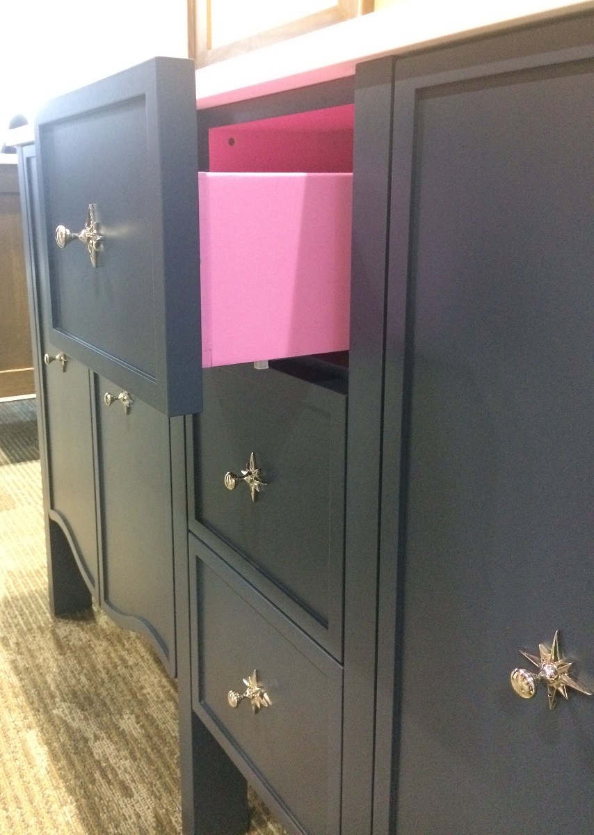 And what if you just want to smile every time you open the vanity drawer. Ok, maybe “interior painted pink” isn’t for you, but we thought it was a great way for the cabinet maker to show off their willingness to do whatever it takes.