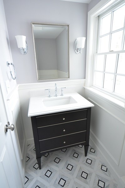 Applied Molding is a great way to add an extra detail to a space with a little less work and a nice result. Powder rooms and front foyers are popular places to add this look into already existing spaces so the existing baseboards and door and window trim are not impacted. The powder room shown already has a beautiful floor and furniture vanity, and the wainscot adds that extra detail that pulls it all together.